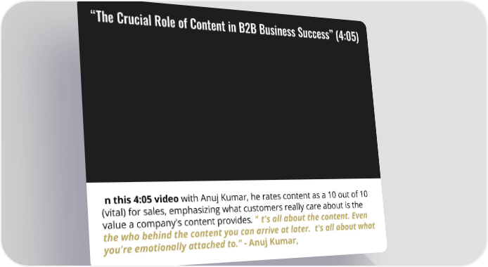 “The Crucial Role of Content in B2B Business Success” (4:05) In this 4:05 video with Anuj Kumar, he rates content as a 10 out of 10 (vital) for sales, emphasizing what customers really care about is the value a company's content provides. "It's all about the content. Even the who behind the content you can arrive at later. It's all about what you're emotionally attached to." - Anuj Kumar,