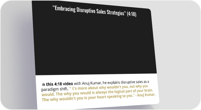 “Embracing Disruptive Sales Strategies” (4:18) In this 4:18 video with Anuj Kumar, he explains disruptive sales as a paradigm shift. "It's more about why wouldn't you, not why you would. The why you would isalways the logical part of your brain. The why wouldn't you is your heart speaking to you." - Anuj Kumar,
