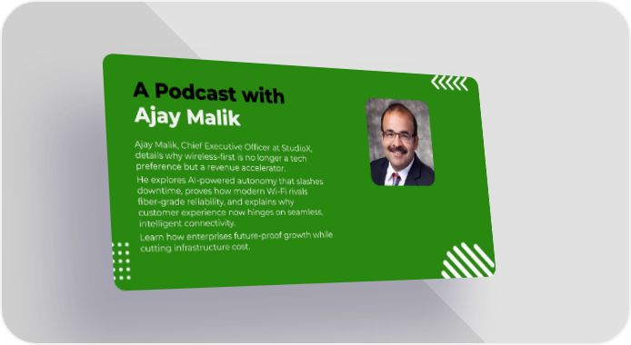 EPISODE: A Podcast with Ajay Malik Ajay Malik, Chief Executive Officer at StudioX, details why wireless-first is no longer a tech preference but a revenue accelerator. He explores AI-powered autonomy that slashes downtime, proves how modern Wi-Fi rivals fiber-grade reliability, and explains why customer experience now hinges on seamless, intelligent connectivity. Learn how enterprises future-proof growth while cutting infrastructure cost.