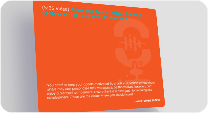 (5:36 Video) Enhancing Agent Careers Through Continuous Learning and Development “You need to keep your agents motivated by creating a positive environment where they can personalize their workspace, be themselves, have fun, and enjoy a pleasant atmosphere. Ensure there is a clear path for learning and development. These are the areas where you should invest.” -ANNE-SOPHIE ENGERT