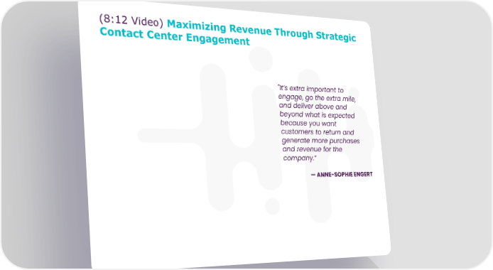 (8:12 Video) Maximizing Revenue Through Strategic Contact Center Engagement "It’s extra important to engage, go the extra mile, and deliver above and beyond what is expected because you want customers to return and generate more purchases and revenue for the company.“ —ANNE-SOPHIE ENGERT