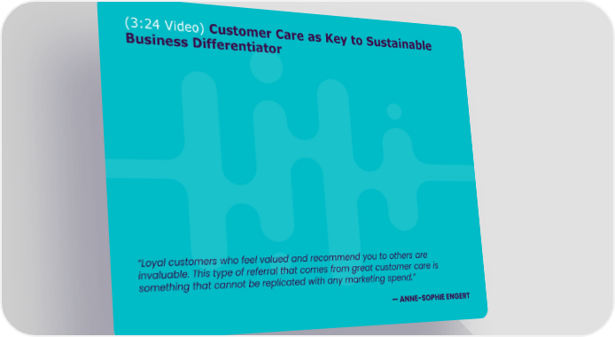 (3:24 Video) Customer Care as Key to Sustainable Business Differentiator “Loyal customers who feel valued and recommend you to others are invaluable. This type of referral that comes from great customer care is something that cannot be replicated with any marketing spend.” —ANNE-SOPHIE ENGERT
