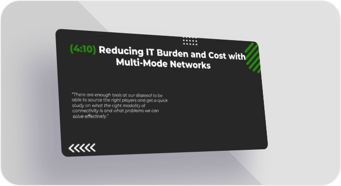 11 (4:10) Reducing IT Burden and Cost with Multi-Mode Networks “There are enough tools at our disposal to be able to source the right players and get a quick study on what the right modality of connectivity is and what problems we can solve effectively.”