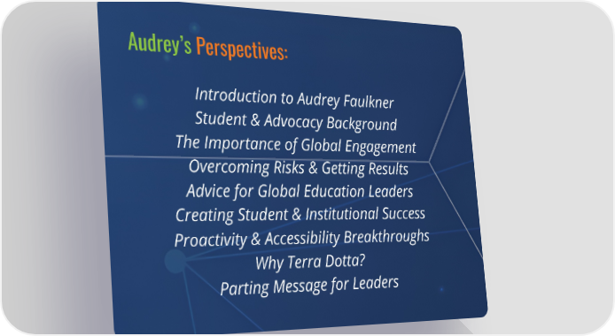 Audrey’s Perspectives: Introduction to Audrey Faulkner Student & Advocacy Background The Importance of Global Engagement Overcoming Risks & Getting Results Advice for Global Education Leaders Creating Student & Institutional Success Proactivity & Accessibility Breakthroughs Why Terra Dotta? Parting Message for Leaders