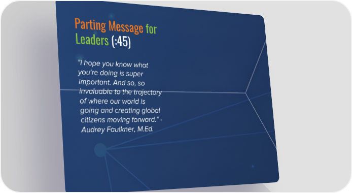 Parting Message for Leaders (:45) "I hope you know what you're doing is super important. And so, so invaluable to the trajectory of where our world is going and creating global citizens moving forward." - Audrey Faulkner, M.Ed.
