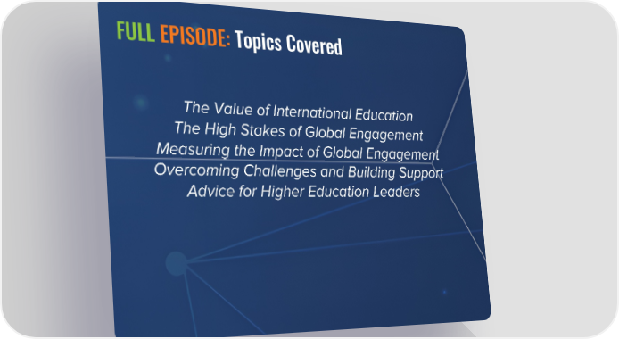FULL EPISODE: Topics Covered The Value of International Education The High Stakes of Global Engagement Measuring the Impact of Global Engagement Overcoming Challenges and Building Support Advice for Higher Education Leaders