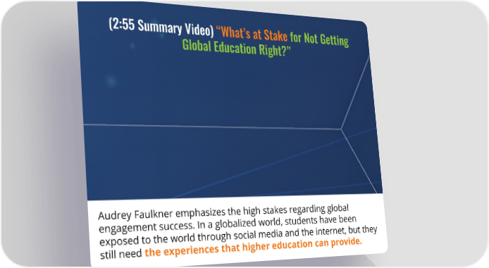 (2:55 Summary Video) “What’s at Stake for Not Getting Global Education Right?” Audrey Faulkner emphasizes the high stakes regarding global engagement success. In a globalized world, students have been exposed to the world through social media and the internet, but they still need the experiences that higher education can provide.