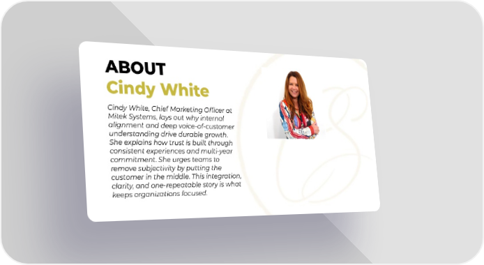 ABOUT Cindy White Cindy White, Chief Marketing Officer at Mitek Systems, lays out why internal alignment and deep voice-of-customer understanding drive durable growth. She explains how trust is built through consistent experiences and multi-year commitment. She urges teams to remove subjectivity by putting the customer in the middle. This integration, clarity, and one-repeatable story is what keeps organizations focused.