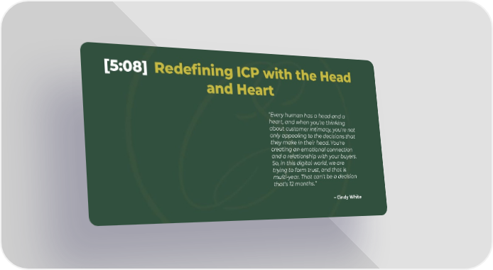 [5:08] Redefining ICP with the Head and Heart “Every human has a head and a heart, and when you're thinking about customer intimacy, you're not only appealing to the decisions that they make in their head. You're creating an emotional connection and a relationship with your buyers. So, in this digital world, we are trying to form trust, and that is multi-year. That can't be a decision that's 12 months.” – Cindy White