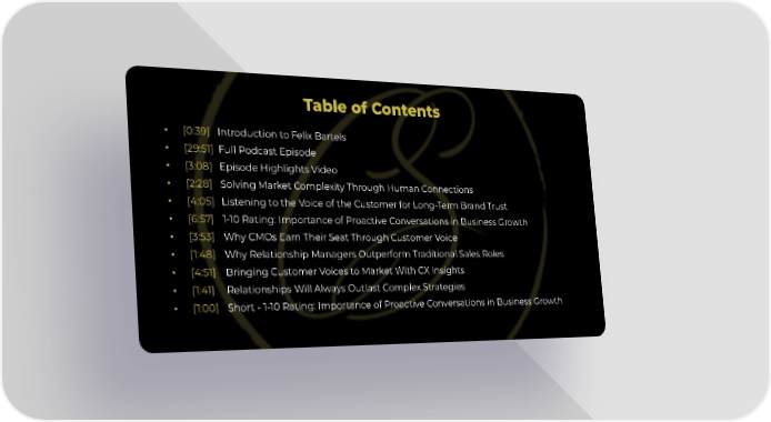 Table of Contents [0:39] Introduction to Felix Bartels [29:51] Full Podcast Episode [3:08] Episode Highlights Video [2:28] Solving Market Complexity Through Human Connections [4:05] Listening to the Voice of the Customer for Long-Term Brand Trust [6:57] 1-10 Rating: Importance of Proactive Conversations in Business Growth [3:53] Why CMOs Earn Their Seat Through Customer Voice [1:48] Why Relationship Managers Outperform Traditional Sales Roles [4:51] Bringing Customer Voices to Market With CX Insights [1:41] Relationships Will Always Outlast Complex Strategies [1:00] Short - 1-10 Rating: Importance of Proactive Conversations in Business Growth