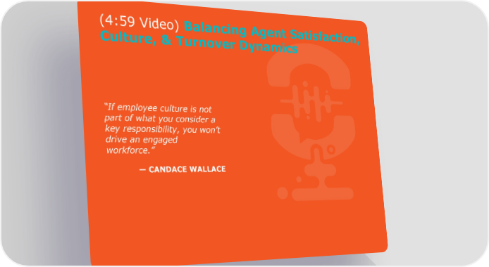 (4:59 Video) Balancing Agent Satisfaction, Culture, & Turnover Dynamics “If employee culture is not part of what you consider a key responsibility, you won’t drive an engaged workforce.” —CANDACE WALLACE Candace Wallace - "CCOs: Why Advocate for Downward CSAT Trends" Page 10 Page 12Video Player is loading.Play VideoPlaySkip BackwardSkip ForwardMuteCurrent Time 0:00/Duration 4:59Loaded: 0.00%0:00Stream Type LIVESeek to live, currently behind liveLIVERemaining Time -4:59 1xPlayback RateChaptersChaptersDescriptionsdescriptions off, selectedCaptionscaptions settings, opens captions settings dialogcaptions off, selectedAudio TrackPicture-in-PictureFullscreenThis is a modal window.Beginning of dialog window. Escape will cancel and close the window.TextColorWhiteBlackRedGreenBlueYellowMagentaCyanOpacityOpaqueSemi-TransparentText BackgroundColorBlackWhiteRedGreenBlueYellowMagentaCyanOpacityOpaqueSemi-TransparentTransparentCaption Area BackgroundColorBlackWhiteRedGreenBlueYellowMagentaCyanOpacityTransparentSemi-TransparentOpaqueFont Size50%75%100%125%150%175%200%300%400%Text Edge StyleNoneRaisedDepressedUniformDrop shadowFont FamilyProportional Sans-SerifMonospace Sans-SerifProportional SerifMonospace SerifCasualScriptSmall CapsResetDoneClose Modal DialogEnd of dialog window.video