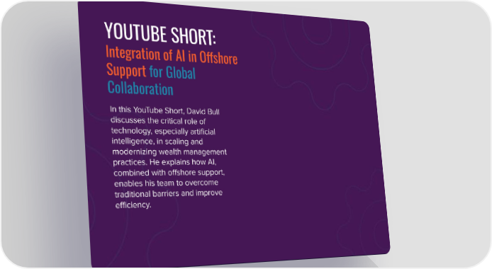YOUTUBE SHORT: Integration of AI in Offshore Support for Global Collaboration In this YouTube Short, David Bull discusses the critical role of technology, especially artificial intelligence, in scaling and modernizing wealth management practices. He explains how AI, combined with offshore support, enables his team to overcome traditional barriers and improve efficiency.