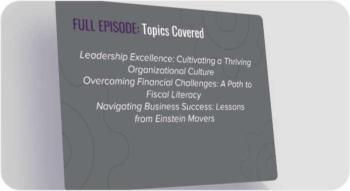 FULL EPISODE: Topics Covered Leadership Excellence: Cultivating a Thriving Organizational Culture Overcoming Financial Challenges: A Path to Fiscal Literacy Navigating Business Success: Lessons from Einstein Movers