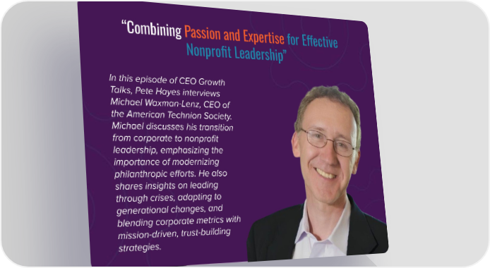 “Combining Passion and Expertise for E昀昀ective Nonprofit Leadership” In this episode of CEO Growth Talks, Pete Hayes interviews Michael Waxman-Lenz, CEO of the American Technion Society. Michael discusses his transition from corporate to nonprofit leadership, emphasizing the importance of modernizing philanthropic efforts. He also shares insights on leading through crises, adapting to generational changes, and blending corporate metrics with mission-driven, trust-building strategies.