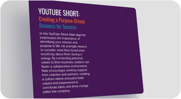 YOUTUBE SHORT: Creating a Purpose-Driven Business for Success In this YouTube Short, Nate Agentis emphasizes the importance of identifying your mission and purpose in life. He prompts viewers to consider what their loved ones would say about them during a eulogy. By connecting personal values to their business, leaders can foster a collaborative environment. Nate encourages seeking support from coaches and partners, creating a culture where everyone feels valued and empowered to contribute ideas and drive change within the company.