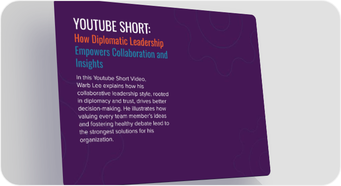 YOUTUBE SHORT: How Diplomatic Leadership Empowers Collaboration and Insights In this Youtube Short Video, Warb Lee explains how his collaborative leadership style, rooted in diplomacy and trust, drives better decision-making. He illustrates how valuing every team member’s ideas and fostering healthy debate lead to the strongest solutions for his organization.