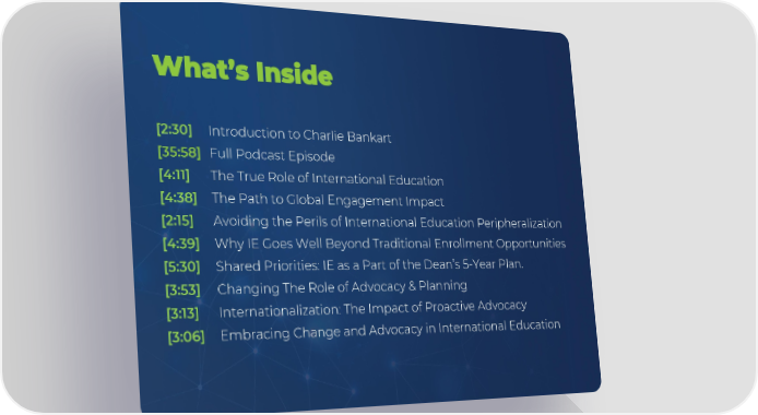 What’s Inside [2:30] Introduction to Charlie Bankart [35:58] Full Podcast Episode [4:11] The True Role of International Education [4:38] The Path to Global Engagement Impact [2:15] Avoiding the Perils of International Education Peripheralization [4:39] Why IE Goes Well Beyond Traditional Enrollment Opportunities [5:30] Shared Priorities: IE as a Part of the Dean’s 5-Year Plan. [3:53] Changing The Role of Advocacy & Planning [3:13] Internationalization: The Impact of Proactive Advocacy [3:06] Embracing Change and Advocacy in International Education