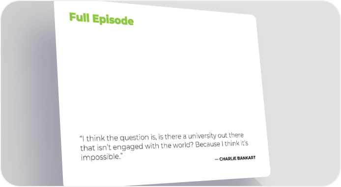 Full Episode “I think the question is, is there a university out there that isn’t engaged with the world? Because I think it’s impossible.” —CHARLIE BANKART
