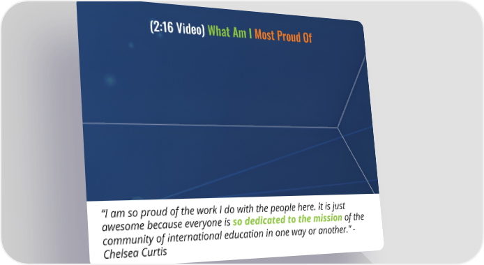 (2:16 Video) What Am I Most Proud Of “I am so proud of the work I do with the people here. It is just awesome because everyone is so dedicated to the mission of the community of international education in one way or another.” - Chelsea Curtis