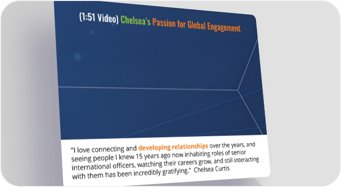 (1:51 Video) Chelsea’s Passion for Global Engagement "I love connecting and developing relationships over the years, and seeing people I knew 15 years ago now inhabiting roles of senior international officers, watching their careers grow, and still interacting with them has been incredibly gratifying." Chelsea Curtis
