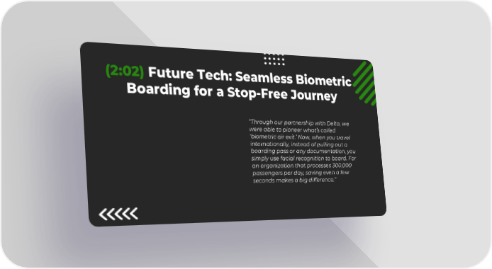 8 (2:02) Future Tech: Seamless Biometric Boarding for a Stop-Free Journey “Through our partnership with Delta, we were able to pioneer what’s called ‘biometric air exit.’ Now, when you travel internationally, instead of pulling out a boarding pass or any documentation, you simply use facial recognition to board. For an organization that processes 300,000 passengers per day, saving even a few seconds makes a big difference.”