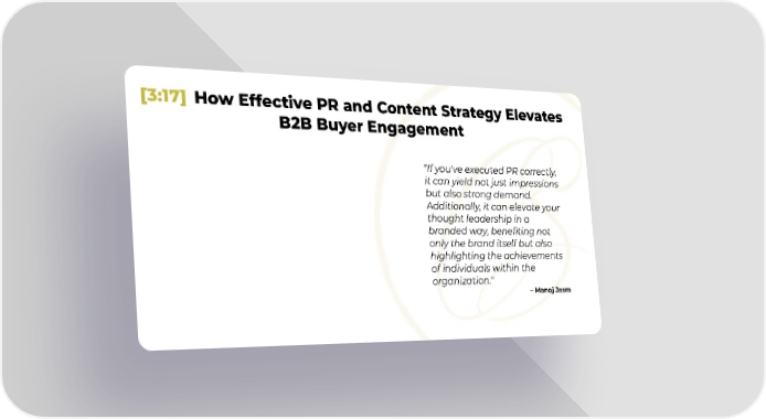 [3:17] How Effective PR and Content Strategy Elevates B2B Buyer Engagement "If you've executed PR correctly, it can yield not just impressions but also strong demand. Additionally, it can elevate your thought leadership in a branded way, benefiting not only the brand itself but also highlighting the achievements of individuals within the organization." – Manoj Jasra