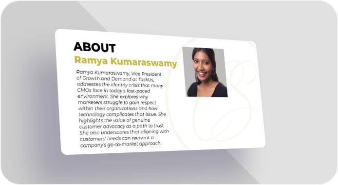 ABOUT Ramya Kumaraswamy Ramya Kumaraswamy, Vice President of Growth and Demand at TaskUs, addresses the identity crisis that many CMOs face in today’s fast-paced environment. She explores why marketers struggle to gain respect within their organizations and how technology complicates that issue. She highlights the value of genuine customer advocacy as a path to trust. She also underscores that aligning with customers’ needs can reinvent a company’s go-to-market approach.