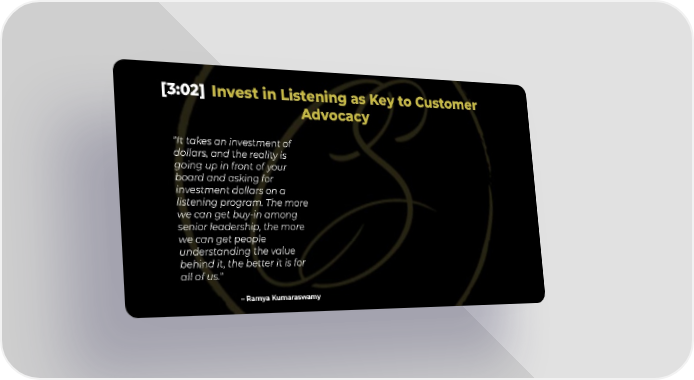 [3:02] Invest in Listening as Key to Customer Advocacy "It takes an investment of dollars, and the reality is going up in front of your board and asking for investment dollars on a listening program. The more we can get buy-in among senior leadership, the more we can get people understanding the value behind it, the better it is for all of us." – Ramya Kumaraswamy
