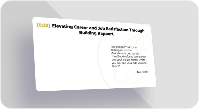 [0:29] Elevating Career and Job Satisfaction Through Building Rapport "Build rapport with your colleagues in other departments and teams. They’ll add value to your career and your job, no matter where you are, and you’ll add value to theirs." – Dawn Mueller