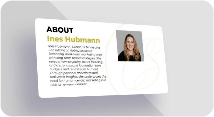 ABOUT Ines Hubmann Ines Hubmann, Senior CX Marketing Consultant at Huble, discusses balancing short-term marketing wins with long-term brand strategies. She reveals how empathy, active listening, and a strong brand foundation save budgets and teams from burnout. Through personal anecdotes and real-world insights, she underscores the need for human-centric marketing in a tech-driven environment.