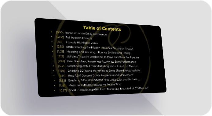 Table of Contents • [0:50] Introduction to Emily Ferdinando • [31:33] Full Podcast Episode • [2:11] Episode Highlights Video • [2:55] Understanding the Hidden Influence Factors on Growth • [1:03] Mapping and Tracking Influence By Role And Timing • [2:12] Utilizing Thought Leadership to Move and Drive the Pipeline • [2:42] How Brand and Awareness Accelerate Sales Performance • [4:34] Redefining ABM From Marketing Tactic to Full GTM Motion • [1:59] Bridging SDRs and Marketing to Drive Shared Accountability • [4:14] How ABM Content Builds Awareness and Momentum • [5:32] Breaking Silos: How Shared KPIs Unite Sales and Marketing • [1:19] Measure Ruthlessly But Serve People First • [0:57] Short - Redefining ABM From Marketing Tactic to Full GTM Motion