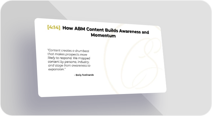 [4:14] How ABM Content Builds Awareness and Momentum “Content creates a drumbeat that makes prospects more likely to respond. We mapped content by persona, industry, and stage from awareness to expansion.” – Emily Ferdinando