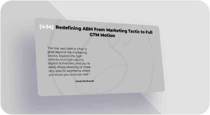 [4:34] Redefining ABM From Marketing Tactic to Full GTM Motion “For me, real ABM is when it goes beyond the marketing tactics, beyond the high velocity and high volume digital activations, and you're really sharp shooting at these very specific segments where you know you resonate well.” – Emily Ferdinando