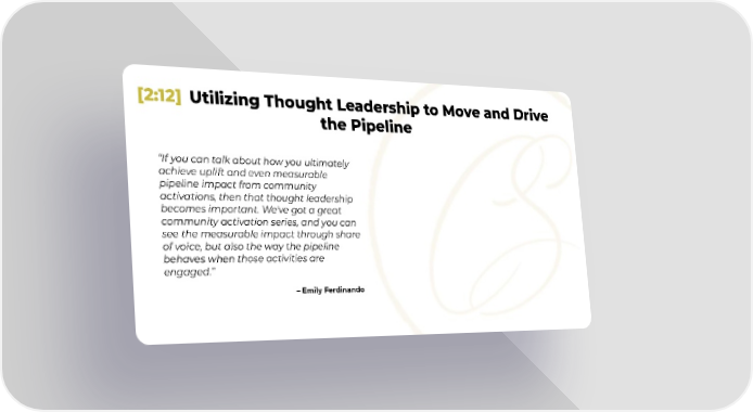 [2:12] Utilizing Thought Leadership to Move and Drive the Pipeline “If you can talk about how you ultimately achieve uplift and even measurable pipeline impact from community activations, then that thought leadership becomes important. We've got a great community activation series, and you can see the measurable impact through share of voice, but also the way the pipeline behaves when those activities are engaged.” – Emily Ferdinando