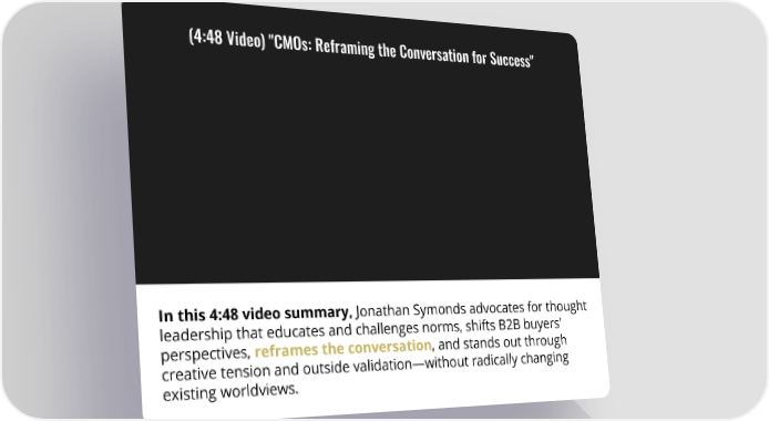 (4:48 Video) "CMOs: Reframing the Conversation for Success" In this 4:48 video summary, Jonathan Symonds advocates for thought leadership that educates and challenges norms, shifts B2B buyers’ perspectives, reframes the conversation, and stands out through creative tension and outside validation—without radically changing existing worldviews.