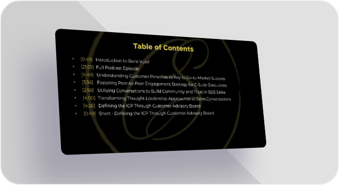 Table of Contents • [0:49] Introduction to Baris Vural • [21:53] Full Podcast Episode • [4:49] Understanding Customer Personas as Key to Go-to-Market Success • [3:36] Fostering Peer-to-Peer Engagement Strategy for C-Suite Executives • [2:56] Utilizing Conversations to Build Community and Trust in B2B Sales • [4:00] Transforming Thought Leadership Approaches to Sales Conversations • [4:26] Defining the ICP Through Customer Advisory Board • [0:49] Short - Defining the ICP Through Customer Advisory Board