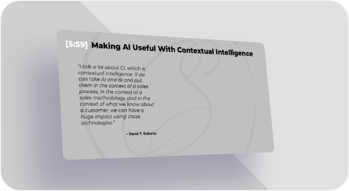 [5:59] Making AI Useful With Contextual Intelligence I talk a lot about CI, which is contextual intelligence. If we can take AI and BI and put them in the context of a sales process, in the context of a sales methodology, and in the context of what we know about a customer, we can have a huge impact using those technologies. David T. Roberts