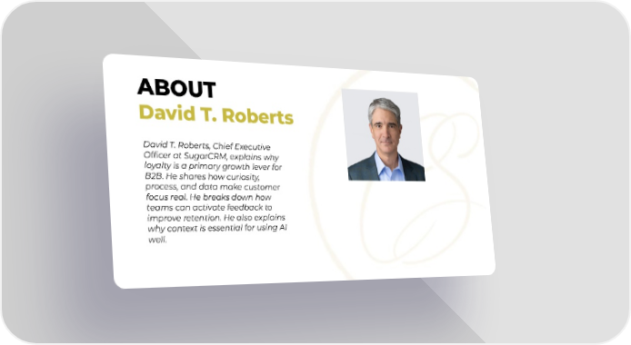 ABOUT David T. Roberts David T. Roberts, Chief Executive Officer at SugarCRM, explains why loyalty is a primary growth lever for B2B. He shares how curiosity, process, and data make customer focus real. He breaks down how teams can activate feedback to improve retention. He also explains why context is essential for using AI well.