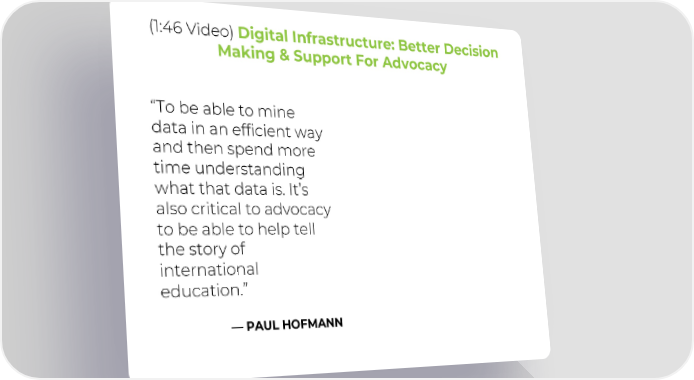 (1:46 Video) Digital Infrastructure: Better Decision Making & Support For Advocacy “To be able to mine data in an efficient way and then spend more time understanding what that data is. It’s also critical to advocacy to be able to help tell the story of international education.” —PAUL HOFMANN