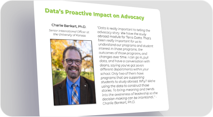 Data’s Proactive Impact on Advocacy Charlie Bankart, Ph.D. "Data is really important to telling the Senior International Officer at advocacy story. We have the study the University of Kansas abroad module for Terra Dotta. That's been really importantfor us to understand our programs and student interest in those programs, the outcomes of those programs, and changes over time. I can go in, pull data, and have a conversation with deans, saying you've got seven different departments within your school. Only two of them have programs that are supporting students to study abroad. Why? We're using the data to construct those stories. To bring meaning and trends into the awareness of leadership so the decision making can be intentional.." - Charlie Bankart, Ph.D.