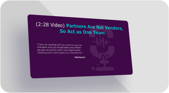 (2:28 Video) Partners Are Not Vendors, So Act as One Team “If you are working with your partner, you are one team and you should take care of them equally as anyone within your organization. Treating them with respect as a real partner.” - Filip Popovic