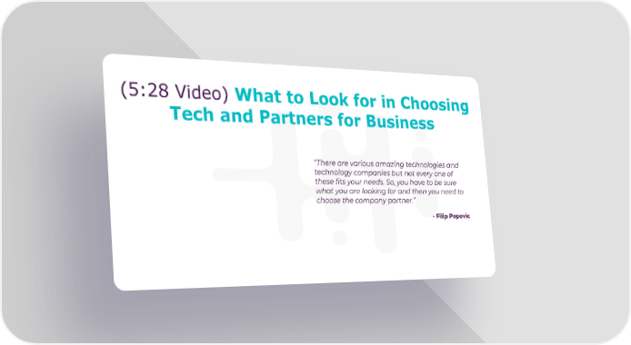 (5:28 Video) What to Look for in Choosing Tech and Partners for Business “There are various amazing technologies and technology companies but not every one of these fits your needs. So, you have to be sure what you are looking for and then you need to choose the company partner.” - Filip Popovic