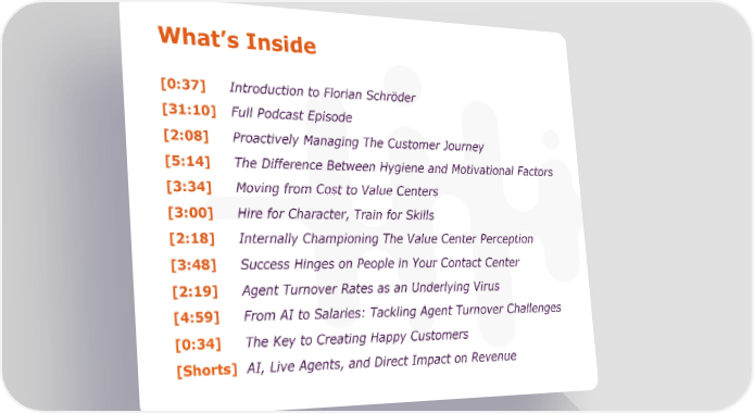 What’s Inside [0:37] Introduction to Florian Schröder [31:10] Full Podcast Episode [2:08] Proactively Managing The Customer Journey [5:14] The Difference Between Hygiene and Motivational Factors [3:34] Moving from Cost to Value Centers [3:00] Hire for Character, Train for Skills [2:18] Internally Championing The Value Center Perception [3:48] Success Hinges on People in Your Contact Center [2:19] Agent Turnover Rates as an Underlying Virus [4:59] From AI to Salaries: Tackling Agent Turnover Challenges [0:34] The Key to Creating Happy Customers [Shorts] AI, Live Agents, and Direct Impact on Revenue
