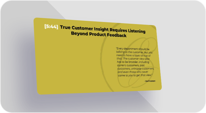 [5:44] True Customer Insight Requires Listening Beyond Product Feedback “Every department should be talking to the customer, but you need to have a layer on top of that. The customer view also has to be broader, including current customers, past customers, unhappy customers, and even those who never came to you to get that view.” – Kari Hanson