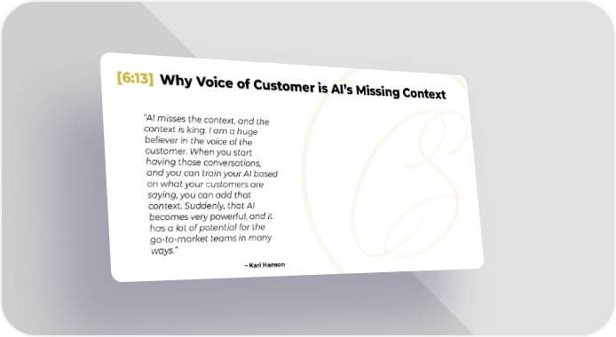 [6:13] Why Voice of Customer is AI’s Missing Context “AI misses the context, and the context is king. I am a huge believer in the voice of the customer. When you start having those conversations, and you can train your AI based on what your customers are saying, you can add that context. Suddenly, that AI becomes very powerful, and it has a lot of potential for the go-to-market teams in many ways.” – Kari Hanson