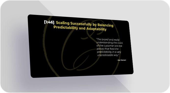 [1:46] Scaling Successfully by Balancing Predictability and Adaptability “The brand and really understanding the voice of the customer are the pieces that feed the predictability in a very unpredictable way.” – Kari Hanson