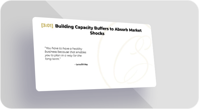 [3:01] Building Capacity Buffers to Absorb Market Shocks “You have to have a healthy business because that enables you to plan in a way for the long term.” – Luna Shirley