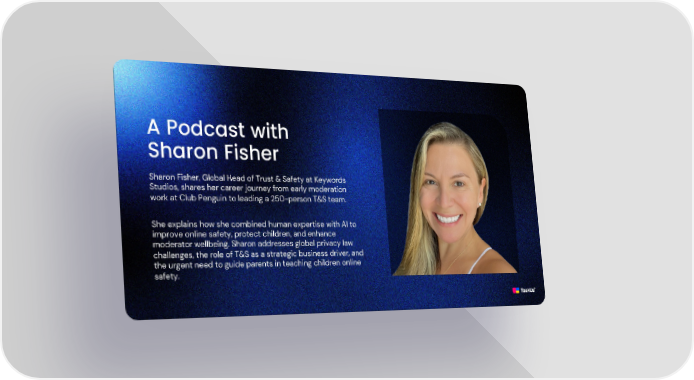 A Podcast with Sharon Fisher Sharon Fisher, Global Head of Trust & Safety at Keywords Studios, shares her career journey from early moderation work at Club Penguin to leading a 250-person T&S team. She explains how she combined human expertise with AI to improve online safety, protect children, and enhance moderator wellbeing. Sharon addresses global privacy law challenges, the role of T&S as a strategic business driver, and the urgent need to guide parents in teaching children online safety.