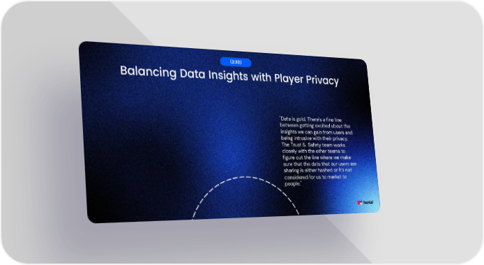 Balancing Data Insights with Player Privacy (2:33) "Data is gold. There’s a fine line between getting excited about the insights we can gain from users and being intrusive with their privacy. The Trust & Safety team works closely with the other teams to figure out the line where we make sure that the data that our users are sharing is either hashed or it's not considered for us to market to people."