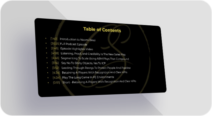 Table of Contents • [1:40] Introduction to Naomi Brezi • [30:25] Full Podcast Episode • [2:45] Episode Highlights Video • [4:58] Listening, Proof, and Credibility Is The New Sales Play • [4:46] Segmenting To Scale Using ABM Plays That Compound • [3:14] Say No To Shiny Objects, Yes To ICP • [3:52] Leading Through Reorgs To Protect People And Pipeline • [4:34] Retaining A-Players With Recognition And Clear KPIs • [4:34] Play The Long Game In PE Environments • [0:51] Short - Retaining A-Players With Recognition And Clear KPIs